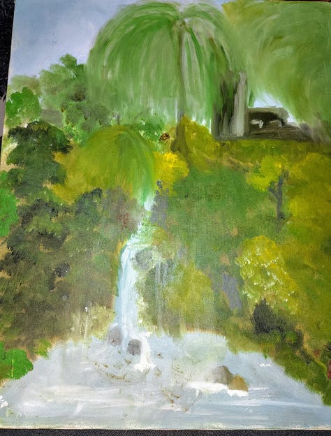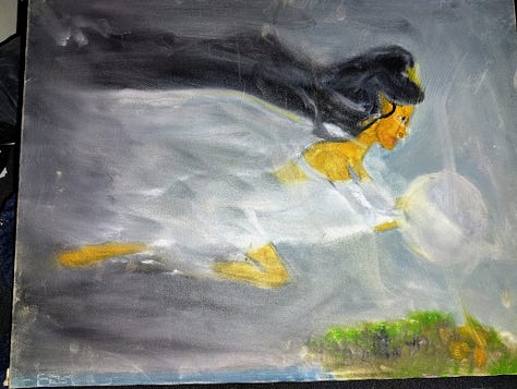 After we made our purchases (support local businesses, y’all) we went out for a fabulous lunch, then stopped by my second family’s house. Turns out they’d been holding onto some old artwork I made back in high school, stuff I’d completely forgotten about. I’m no painter, but they really weren’t half bad. I might even try to clean them up someday.